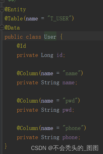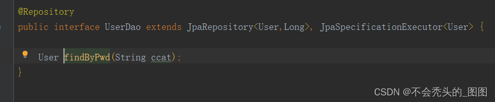@Test void test01(){User user = userDao.findByPwd("ccat");System.out.println("user = " + user); }再來看看我的dao層代碼塊和實體代碼塊