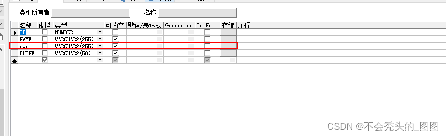 在這里我們可以看到整體的代碼邏輯是沒有問題的,但是再看看數據表結構發現:pwd 字段為小寫,其實PL自動生成的創建表的腳本中,表名和字段名都加了雙引號。雙引號在Oracle中表示區分大小寫,Oracle是嚴格區分大小寫的,未使用雙引號時默認全部大寫。可能很多人都會誤認為oracle是不區分大小寫的,原因是我們在寫查詢語句的時候,大小寫無所謂,結果都是一樣的,這只是個表面現象,只要你不使用雙引號表示區分大小寫,oracle會默認把你寫的腳本全部轉換為大寫的。