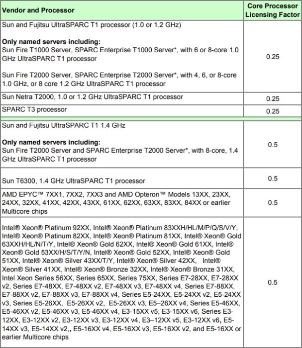 例如,帶有4個八核處理器的SUN UltraSparc T1系統將需要4*8*0.25 = 8個許可證。這只是一個例子。Sun UltraSparc T1和T2不支持SMP,只有Sun UltraSparc T2+支持SMP。類似地,一個帶有4個八核處理器的IBM AIX系統將需要4*8*0.5 = 16個許可證。