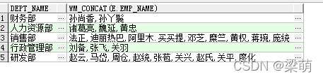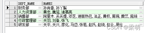 --方法二SELECT d.dept_name,LISTAGG (e.emp_name, ",") WITHIN GROUP (ORDER BY e.emp_name) namesFROM employee eINNER JOIN department d ON d.dept_id=e.dept_idGROUP BY d.dept_name;