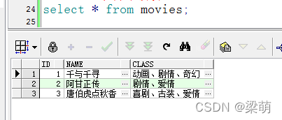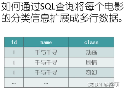 --方法一WITH t (id, name, sub, str) AS ( SELECT id, name, substr(class, 1, instr(class, "、")-1), substr(concat(class,"、"), instr(class, "、")+1) FROM movies UNION ALL SELECT id, name,substr(str, 1, instr(str, "、")-1), substr(str, instr(str, "、")+1) FROM t WHERE instr(str, "、")>0) SELECT id, name, subFROM tORDER BY id;