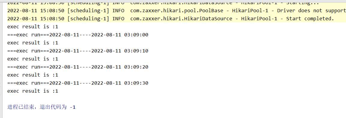 public int exec(){Map<String,Object> map = new HashMap<>();map.put("iv_ins1","ZIY00007709");map.put("iv_ins2","0103");mapper.exec(map);int res = (int)map.get("ov_res");return res; }結果:
