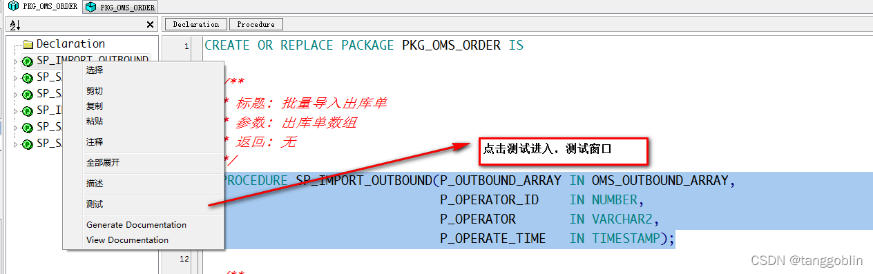 如果想要測試,那么選中相應存儲過程的函數,然后右鍵—》測試,即可。
