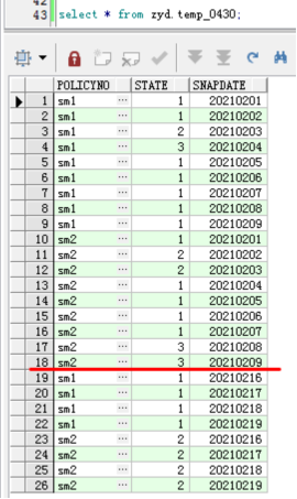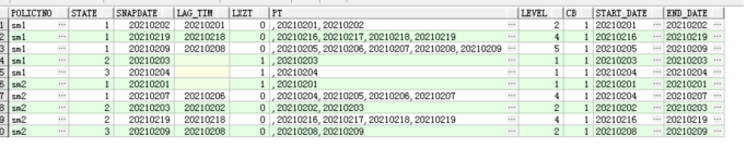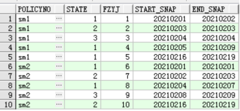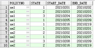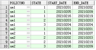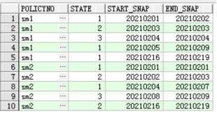 保單號sm1保持狀態(tài)1的起止時間為2021020120210202,然后在20210203時候變成了狀態(tài)2,又在20210204時候變成了狀態(tài)3,最終又在2021020520210209時間段保持在狀態(tài)1,然后鏡像表的程序可能期間出現(xiàn)過問題,在20210210開始到20210215日沒有鏡像成功,直到20210216日才恢復(fù),20210216~20210219日保單號sm1的狀態(tài)一直保持為1,后續(xù)還有可能繼續(xù)變,那么,上面說的保單sm1的幾個狀態(tài)的連續(xù)時間,我們想要的結(jié)果為: