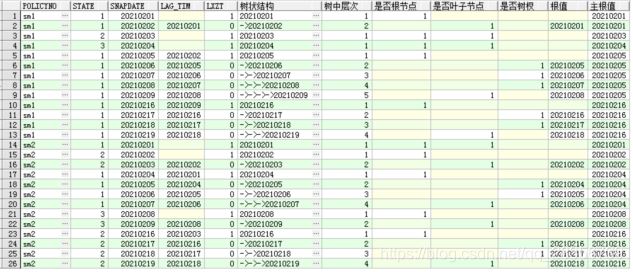 從上面能清晰的看出來,每一次連續(xù)狀態(tài)的開始日期作為每個樹的根,分支節(jié)點即樹杈和葉子節(jié)點的關(guān)系一步步拓展開來,分析上面數(shù)據(jù)我們能夠知道,如果我們想要獲取每個保單狀態(tài)連續(xù)時間范圍,以上面的數(shù)據(jù)現(xiàn)有分布方式,現(xiàn)在就可以:通過policyno,state,主根值進(jìn)行g(shù)roup by 取snapdate的最大最小值,類似前面兩個寫法的最終步驟;