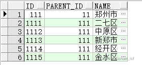 create table area_test( id number(10) not null, parent_id number(10), name varchar2(255) not null);alter table area_test add (constraint district_pk primary key (id));insert into area_test (ID, PARENT_ID, NAME) values (1, null, "中國");insert into area_test (ID, PARENT_ID, NAME) values (11, 1, "河南省"); insert into area_test (ID, PARENT_ID, NAME) values (12, 1, "北京市");insert into area_test (ID, PARENT_ID, NAME) values (111, 11, "鄭州市");insert into area_test (ID, PARENT_ID, NAME) values (112, 11, "平頂山市");insert into area_test (ID, PARENT_ID, NAME) values (113, 11, "洛陽市");insert into area_test (ID, PARENT_ID, NAME) values (114, 11, "新鄉市");insert into area_test (ID, PARENT_ID, NAME) values (115, 11, "南陽市");insert into area_test (ID, PARENT_ID, NAME) values (121, 12, "朝陽區");insert into area_test (ID, PARENT_ID, NAME) values (122, 12, "昌平區");insert into area_test (ID, PARENT_ID, NAME) values (1111, 111, "二七區");insert into area_test (ID, PARENT_ID, NAME) values (1112, 111, "中原區");insert into area_test (ID, PARENT_ID, NAME) values (1113, 111, "新鄭市");insert into area_test (ID, PARENT_ID, NAME) values (1114, 111, "經開區");insert into area_test (ID, PARENT_ID, NAME) values (1115, 111, "金水區");insert into area_test (ID, PARENT_ID, NAME) values (1121, 112, "湛河區");insert into area_test (ID, PARENT_ID, NAME) values (1122, 112, "舞鋼市");insert into area_test (ID, PARENT_ID, NAME) values (1123, 112, "寶豐市");insert into area_test (ID, PARENT_ID, NAME) values (11221, 1122, "尚店鎮");