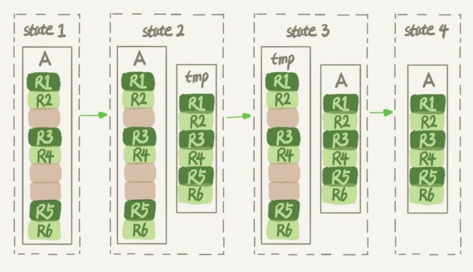 - 臨時(shí)文件生成后,將日志文件中的操作應(yīng)用到臨時(shí)文件,得到一個(gè)邏輯數(shù)據(jù)上與表A相同的數(shù)據(jù)文件,對(duì)應(yīng)的就是圖中state3的狀態(tài);