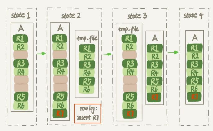 - 生成臨時(shí)文件的過(guò)程中,將所有對(duì)A的操作記錄在一個(gè)日志文件rowlog中,對(duì)應(yīng)的是圖中state2的狀態(tài);
