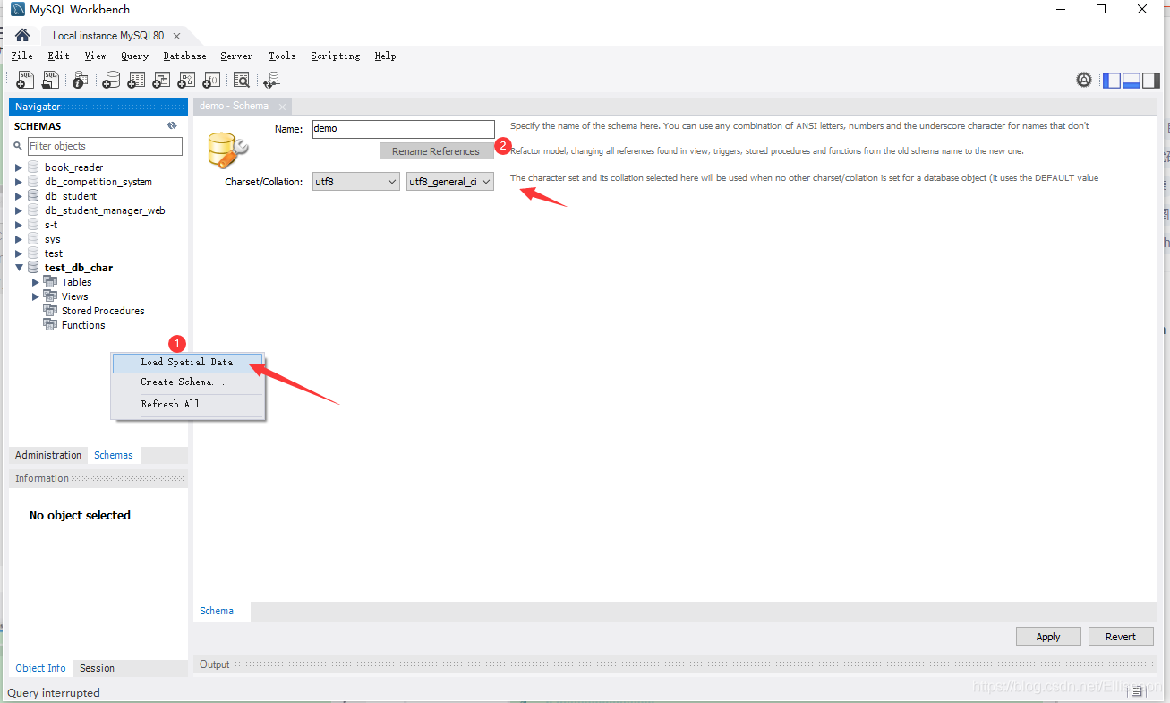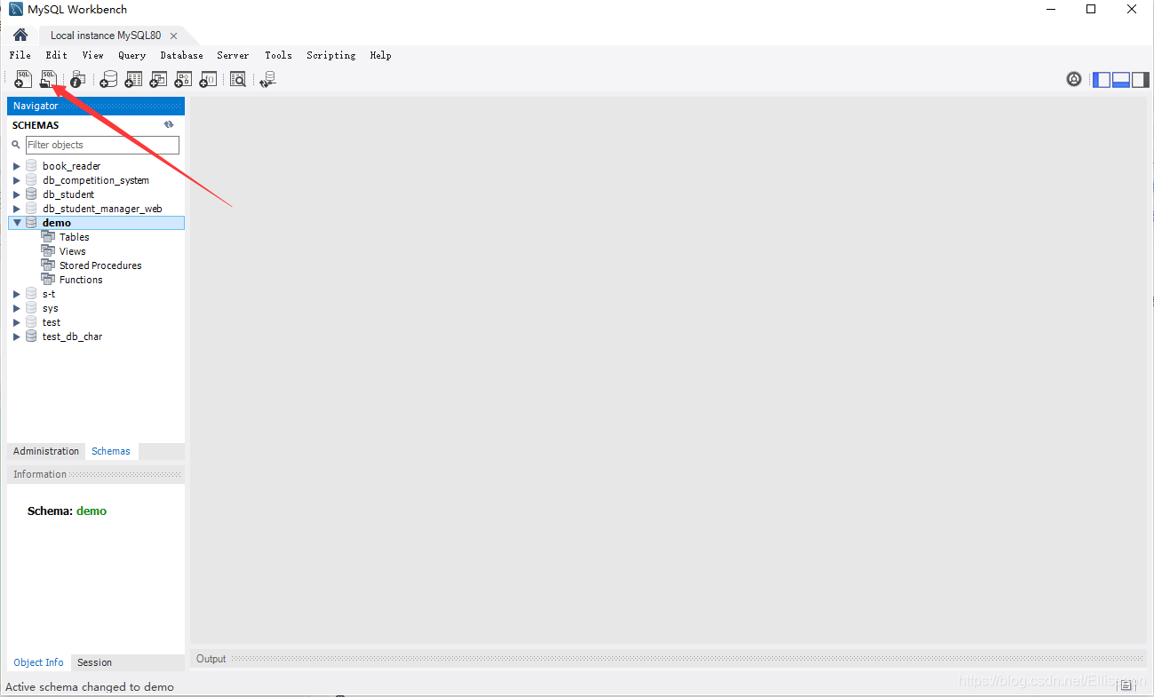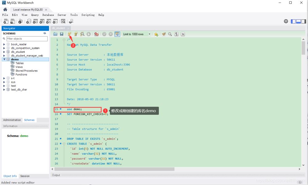 ①.新建一個數據庫demo(名字任取),點擊指示圖標(或者File欄里面的Open SQL Script…)