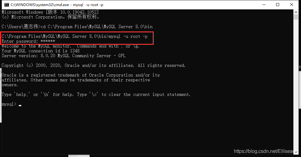3.輸入“mysql -u root -p”,再輸入數據庫密碼;