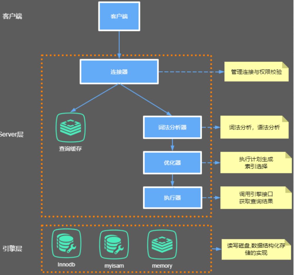 下面我們重點來分析連接器、查詢緩存、分析器、優化器、執行器分別主要干了哪些事情。