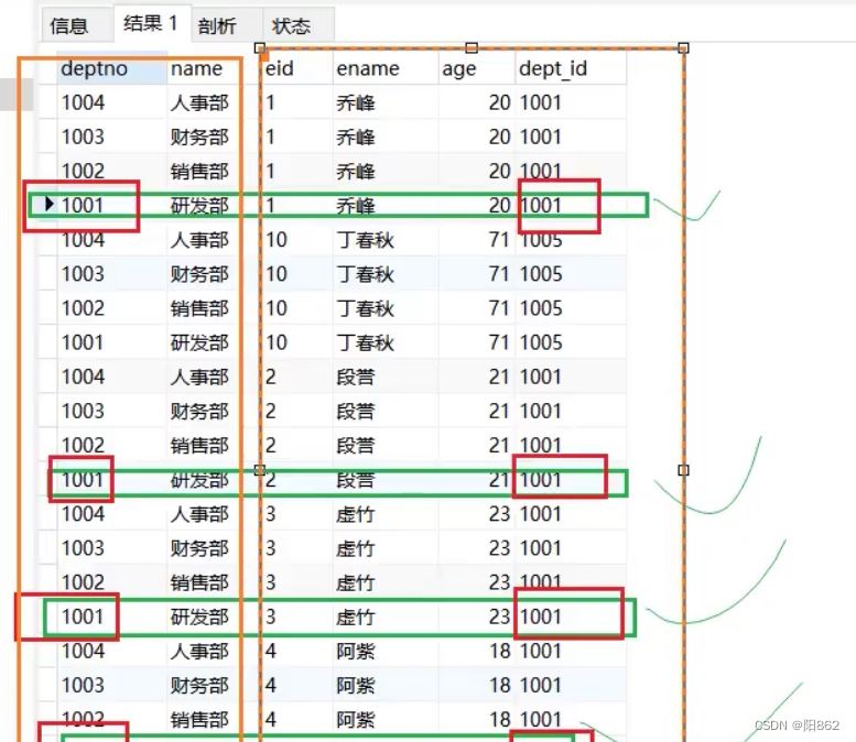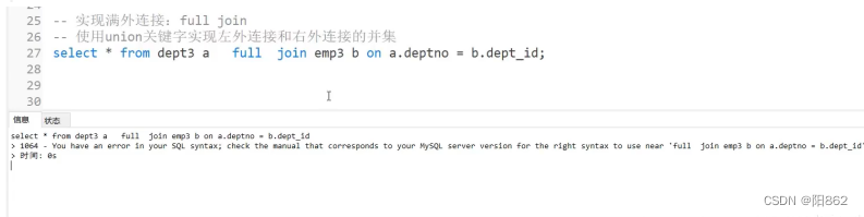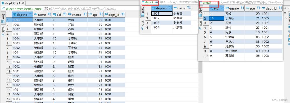 -- 外連接查詢-- 查詢哪些部門有員工,哪些部門沒有員工select * from dept3 left outer join emp3 on dept3.deptno = emp3.dept_id;-- 查詢員工有對應的部門,哪些沒有select * from dept3 right outer join emp3 on dept3.deptno = emp3.dept_id;-- 使用union關鍵字實現左外連接和右外連接的并集select * from dept3 left outer join emp3 on dept3. deptno = emp3.dept_idunionselect * from dept3 right outer join emp3 on dept3.deptno = emp3.dept_id;