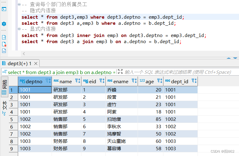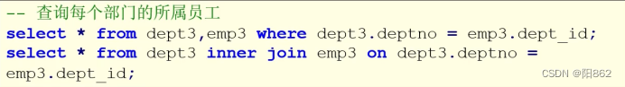 -- 查詢研發部門的所屬員工-- 隱式內連接select * from emp3 e ,dept3 d where e.dept_id =d.deptno and name ="研發部";-- 顯式內連接select * from dept3 d join emp3 e on d.deptno =e.dept_id and name ="研發部"; -- 查詢研發部和銷售部的所屬員工select * from dept3 a join emp3 b on a.deptno = b.dept_id and (name = "研發部" or name = "銷售部") ; select * from dept3 a join emp3 b on a.deptno = b.dept_id and name in("研發部" ,"銷售部") ; -- 查詢每個部門的員工數,并升序排序 select a.name,a.deptno,count(1) from dept3 a join emp3 b on a.deptno = b.dept_id group by a.deptno,name; -- 查詢人數大于等于3的部門,并按照人數降序排序 select a.deptno, a.name, count(1) as total_cntfrom dept3 a join emp3 b on a.deptno = b.dept_idgroup by a.deptno,a.namehaving total_cnt >= 3order by total_cnt desc;外連接