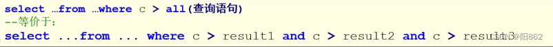 - ALL表示指定列中的值必須要大于子查詢集的每一個值,即必須要大于子查詢集的最大值;如果是小于號即小于子查詢集的最小值。同理可以推出其它的比較運算符的情況。