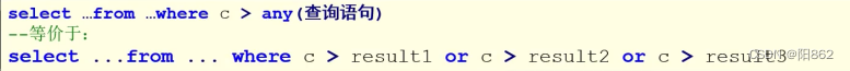 - ANY可以與=、>、>=、<、<=、<>結合是來使用,分別表示等于、大于、大于等于、小于、小于等于、不等于其中的其中的任何一個數據。
