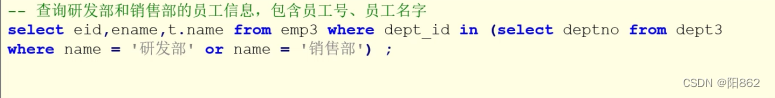 -- 查詢年齡最大的員工信息,顯示信息包含員工號、員工名字,員工年齡select * from emp3 where age=(select max(age) from emp3 ); select eid,ename ,age from emp3 where age = (select max (age) from emp3);-- 查詢年研發部和銷售部的員工信息,包含員工號、員工名字select * from emp3 where emp3.dept_id in (select deptno from dept3 d where d.name="研發部" or d.name="銷售部"); select eid,ename , t.name from emp3 where dept_id in (select deptno, name from dept3where name ="研發部"or name ="銷售部");-- 查詢研發部20歲以下的員工信息,包括員工號、員工名字,部門名字 -- 方式一:關聯查詢select * from dept3 d join emp3 e on d.deptno =e.dept_id and (d.name="研發部" and e.age<20); -- 方式二:子查詢select eid,age ,ename , name from (select * from dept3 where name = "研發部")t1 , (select * from emp3 where age <20) t2 where t1.deptno =t2.dept_id ; select eid,age ,ename , name from (select * from dept3 where name = "研發部")t1 join (select * from emp3 where age <20) t2 on t1.deptno =t2.dept_id ;