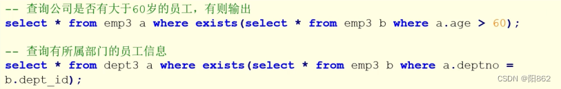 - EXISTS后面的子查詢不返回任何實際數據,只返回真或假,當返回真時 where條件成立
