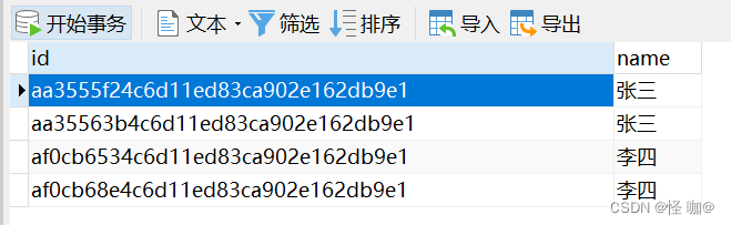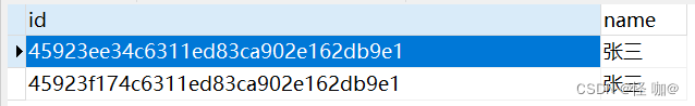 表里有兩條數據,然后名字是相同的,但是id是不同的,現在要求是只留一條數據: