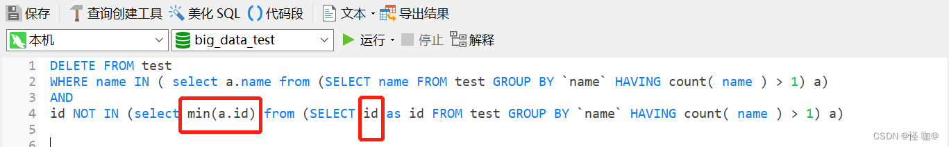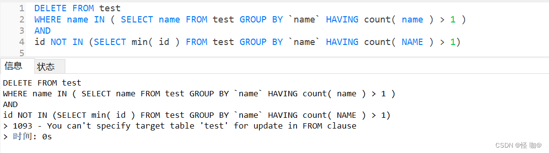 千萬千萬不能這么搞,下面這個語法相當于是先按name分組,然后查出來大于1的,這時候假如大于1的有很多,然后外面嵌套的那一層,只取了最小的一條數據,然后再加上使用的是