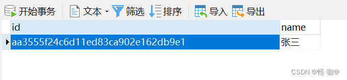 CREATE TABLE `test` ( `id` varchar(32) CHARACTER SET utf8 COLLATE utf8_general_ci NOT NULL COMMENT "注解id", `name` varchar(255) CHARACTER SET utf8 COLLATE utf8_general_ci NULL DEFAULT NULL COMMENT "名字", PRIMARY KEY (`id`) USING BTREE) ENGINE = InnoDB CHARACTER SET = utf8 COLLATE = utf8_general_ci ROW_FORMAT = Compact;INSERT INTO test (id,`name`) VALUES (replace(uuid(),"-",""),"張三"),(replace(uuid(),"-",""),"張三");