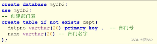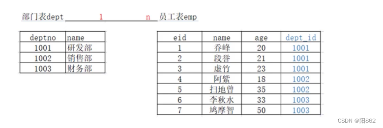 分析:一個(gè)部門有多個(gè)員工,一個(gè)員工只能對(duì)應(yīng)一個(gè)部門實(shí)現(xiàn)原則:在多的一方建立外鍵,指向一的一方的主鍵