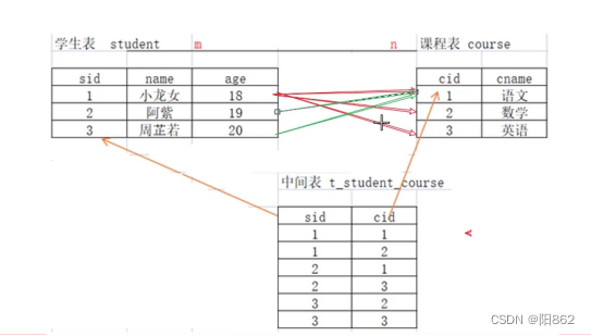 原則:多對(duì)多關(guān)系實(shí)現(xiàn)需要借助第三張中間表。中間表至少包含兩個(gè)字段,將多對(duì)多的關(guān)系,拆成一對(duì)多的關(guān)系,中間表至少要有兩個(gè)外鍵,這兩個(gè)外鍵分別指向原來的那兩張表的主鍵