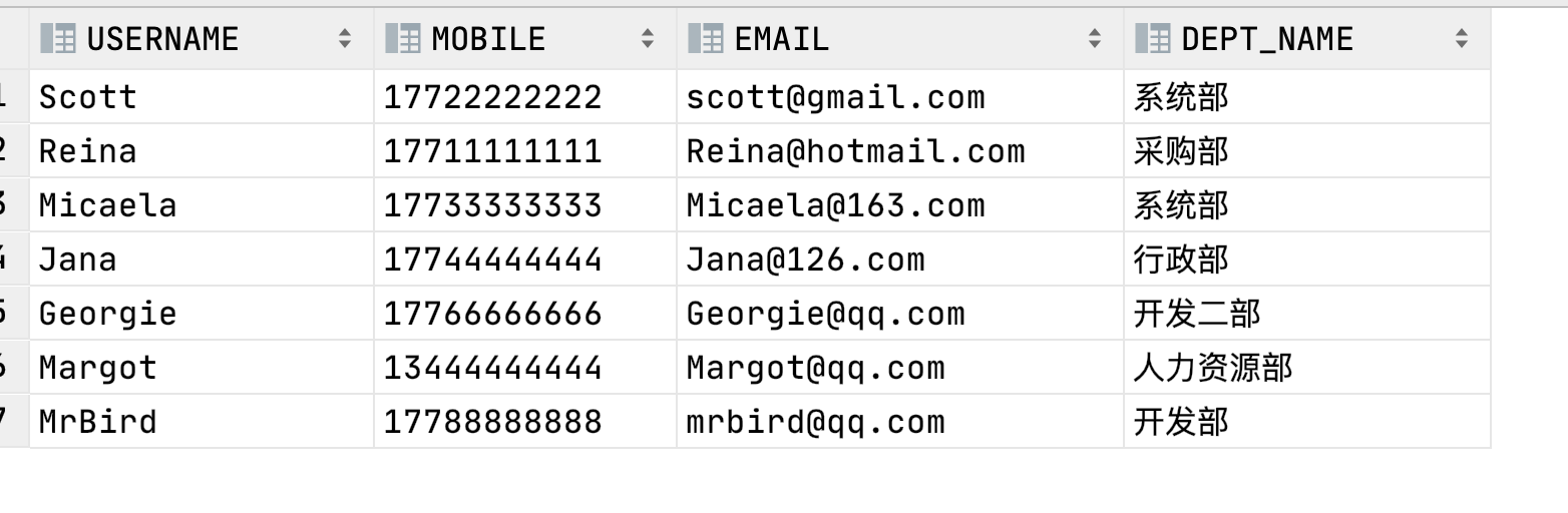 select u.USERNAME, u.MOBILE, u.EMAIL, d.DEPT_NAMEfrom t_user u, t_dept dwhere u.DEPT_ID = d.DEPT_ID