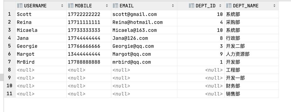 select u.USERNAME, u.MOBILE, u.EMAIL,u.DEPT_ID, d.DEPT_NAMEfrom t_user u right join t_dept don u.DEPT_ID = d.DEPT_ID