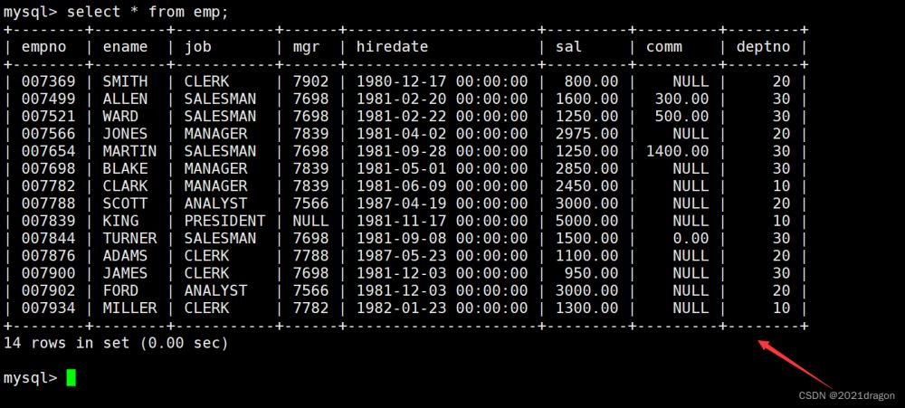 部門表中的dname代表的是部門名,deptno代表的是部門的部門號。如下: