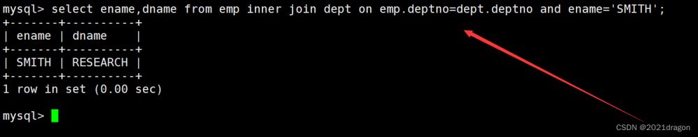 現在要顯示SMITH的名字和其所在部門的名稱,按照復合查詢的做法就是,取員工表和部門表的笛卡爾積,在where子句中指明篩選條件為員工的部門號等于部門的部門號,篩選出每個員工匹配的部門信息,并指明員工姓名為SMITH,篩選出SMITH的信息和其所在部門的信息。如下: