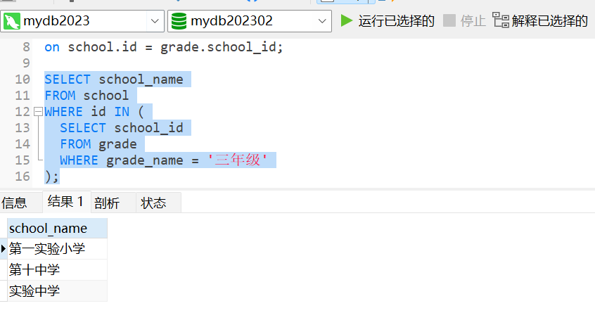 編程目標:以下是一個使用子查詢的示例,用于檢索包含特定年級名稱的學校列表: