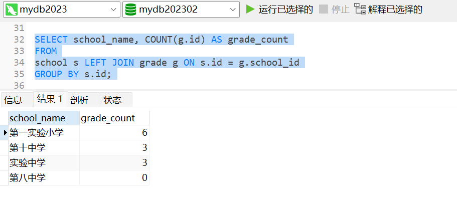 注意,在GROUP BY子句中使用了學校表的ID列,而不是名稱列。