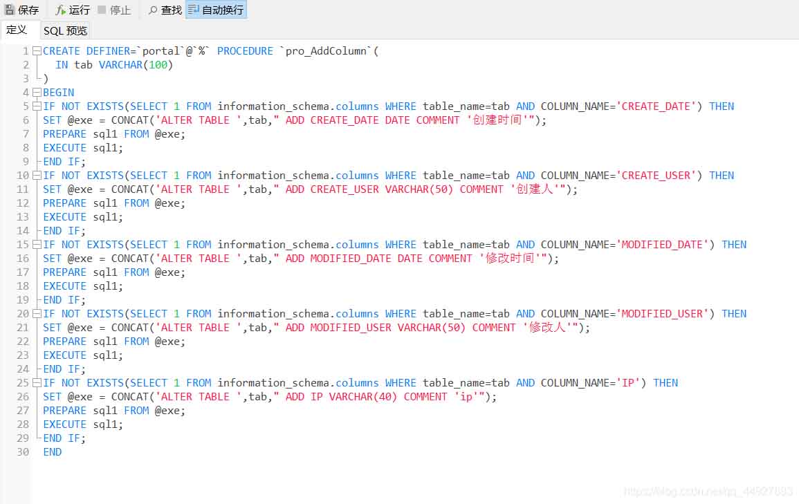 CREATE DEFINER=`portal`@`%` PROCEDURE `pro_AddColumn`( IN tab VARCHAR(100))BEGINIF NOT EXISTS(SELECT 1 FROM information_schema.columns WHERE table_name=tab AND COLUMN_NAME="CREATE_DATE") THENSET @exe = CONCAT("ALTER TABLE ",tab," ADD CREATE_DATE DATE COMMENT "創建時間"");PREPARE sql1 FROM @exe;EXECUTE sql1;END IF;IF NOT EXISTS(SELECT 1 FROM information_schema.columns WHERE table_name=tab AND COLUMN_NAME="CREATE_USER") THENSET @exe = CONCAT("ALTER TABLE ",tab," ADD CREATE_USER VARCHAR(50) COMMENT "創建人"");PREPARE sql1 FROM @exe;EXECUTE sql1;END IF;IF NOT EXISTS(SELECT 1 FROM information_schema.columns WHERE table_name=tab AND COLUMN_NAME="MODIFIED_DATE") THENSET @exe = CONCAT("ALTER TABLE ",tab," ADD MODIFIED_DATE DATE COMMENT "修改時間"");PREPARE sql1 FROM @exe;EXECUTE sql1;END IF;IF NOT EXISTS(SELECT 1 FROM information_schema.columns WHERE table_name=tab AND COLUMN_NAME="MODIFIED_USER") THENSET @exe = CONCAT("ALTER TABLE ",tab," ADD MODIFIED_USER VARCHAR(50) COMMENT "修改人"");PREPARE sql1 FROM @exe;EXECUTE sql1;END IF;IF NOT EXISTS(SELECT 1 FROM information_schema.columns WHERE table_name=tab AND COLUMN_NAME="IP") THENSET @exe = CONCAT("ALTER TABLE ",tab," ADD IP VARCHAR(40) COMMENT "ip"");PREPARE sql1 FROM @exe;EXECUTE sql1;END IF;END