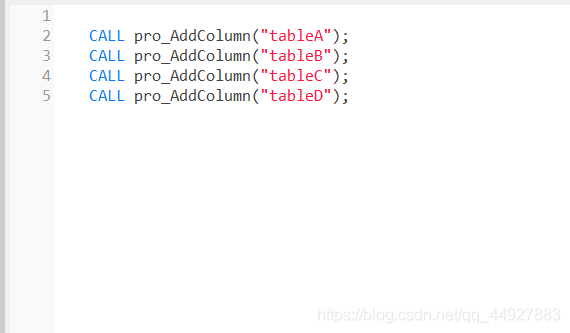 CALL pro_AddColumn("tableA");CALL pro_AddColumn("tableB");CALL pro_AddColumn("tableC");CALL pro_AddColumn("tableD");代碼復制進去執行即可,括號里面是表名