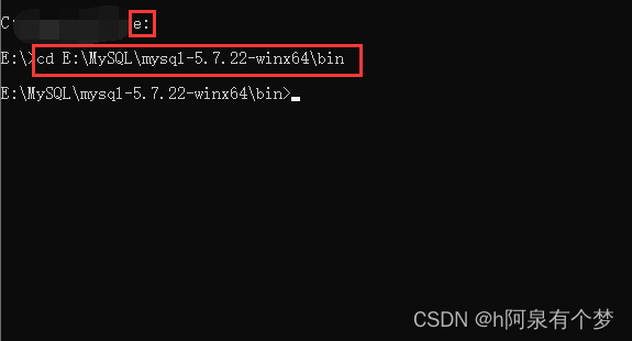 緊接著輸入:cd E:\MySQL\mysql-5.7.22-winx64\bin 回車