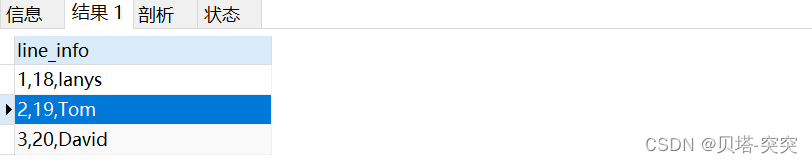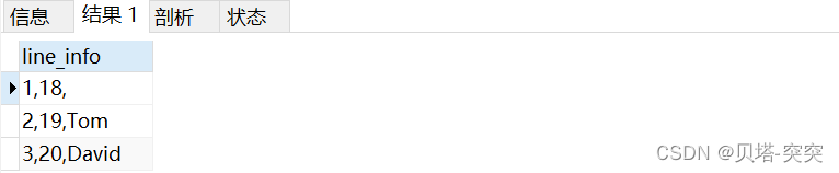 SELECT CONCAT(",",id,name,work_date) FROM employee_tbl; +-----------------------------+ | CONCAT(id, name, work_date) | +-----------------------------+ | 1,John,2022-08-24 | | 2,Ramr,2022-08-27 | | 3,Jack,2022-08-06 | | 3,Jack,2022-08-06 | | 4,Jill,2022-08-06 | | 5,Zara,2022-08-06 | | 5,Zara,2022-08-06 | +-----------------------------+3.group_concat()函數(shù)