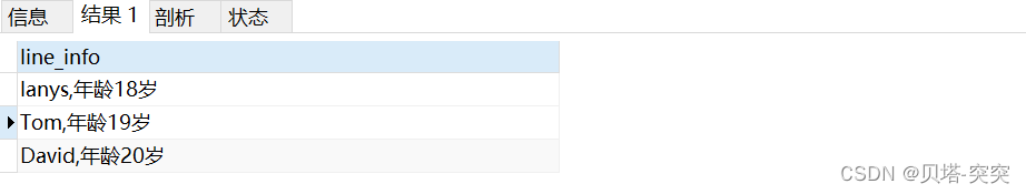 select CONCAT(id,",",age,",",name) AS line_info from user