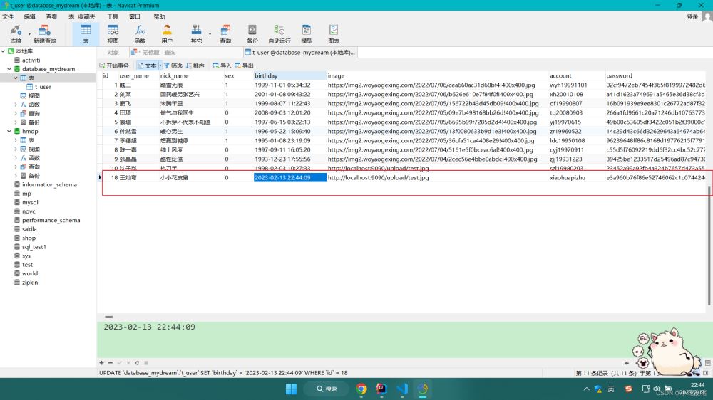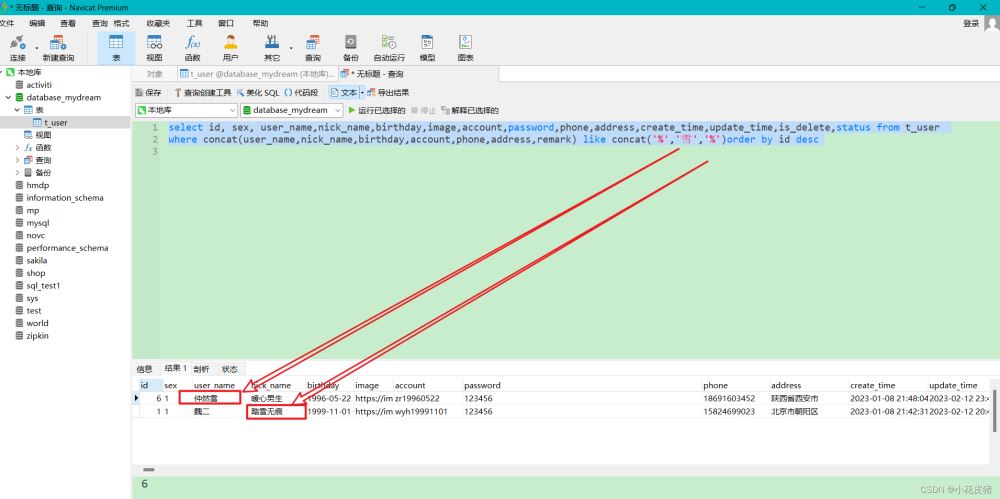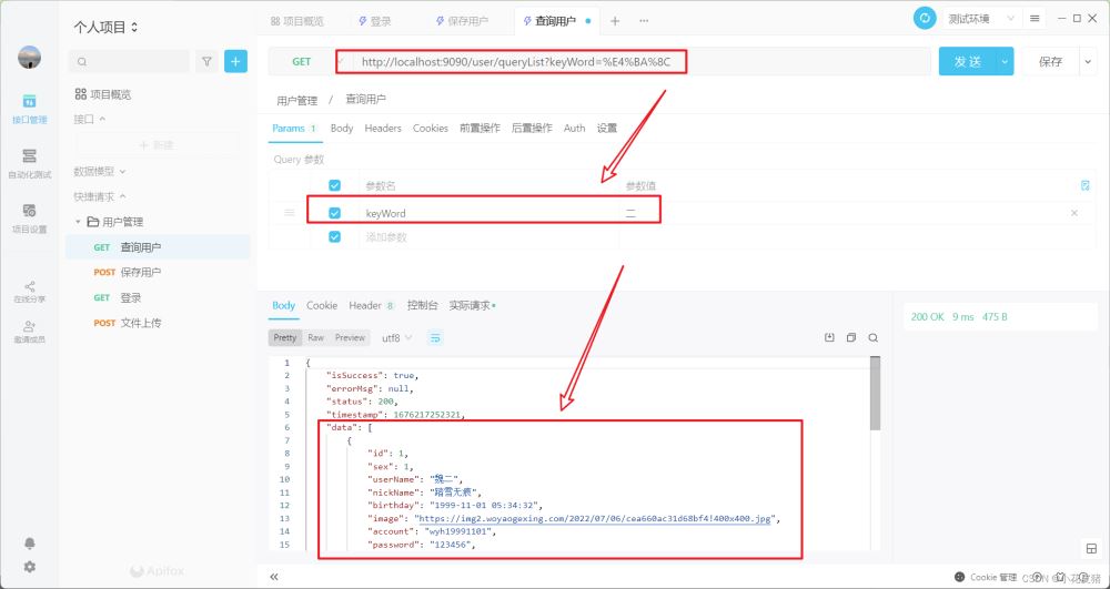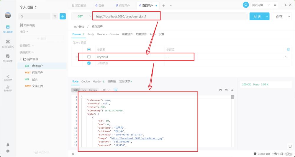List<User> queryUserInfo(@Param("keyWord") String keyWord); <select id="queryUserInfo" resultType="com.wyh.entity.User">selectid,sex,user_name,nick_name,birthday,image,account,password,phone,address,remark,create_time,update_time,is_delete,statusfrom t_user<where> is_delete = 0 <if test="keyWord !=null and keyWord !=""">and concat(id,sex,user_name,nick_name,birthday,image,account, password,phone, address,remark, create_time,update_time,is_delete,status) like concat( "%",#{keyWord},"%") </if></where>order by id desc </select>接口測試