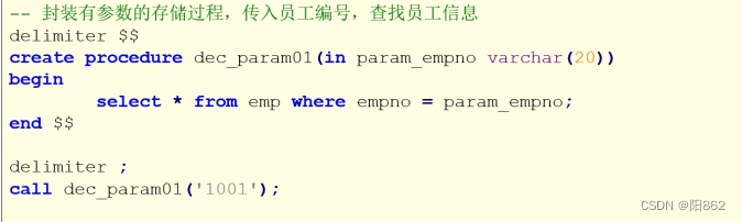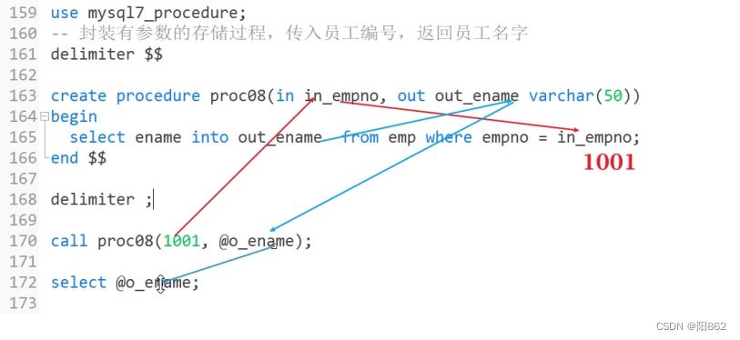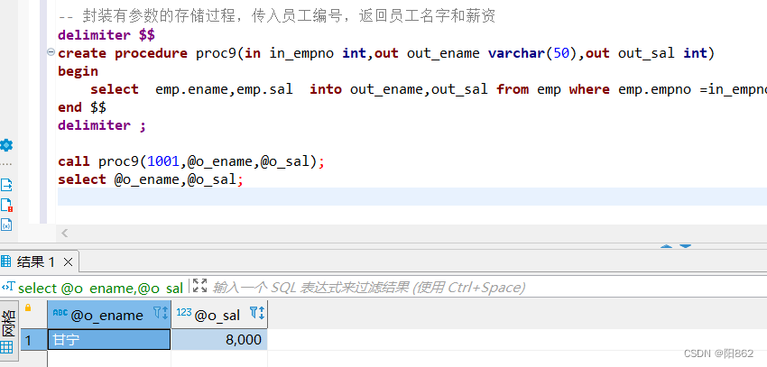 -- 封裝有參數的存儲過程,傳入員工編號,返回員工名字delimiter $$create procedure proc8(in in_empno int,out out_ename varchar(50))begin select ename into out_ename from emp where emp.empno =in_empno;end $$delimiter ; call proc8(1001,@o_ename);-- 執行這一句不會輸出select @o_ename;