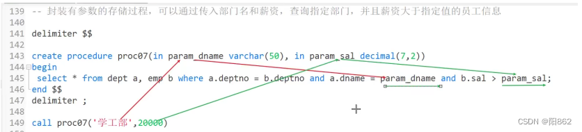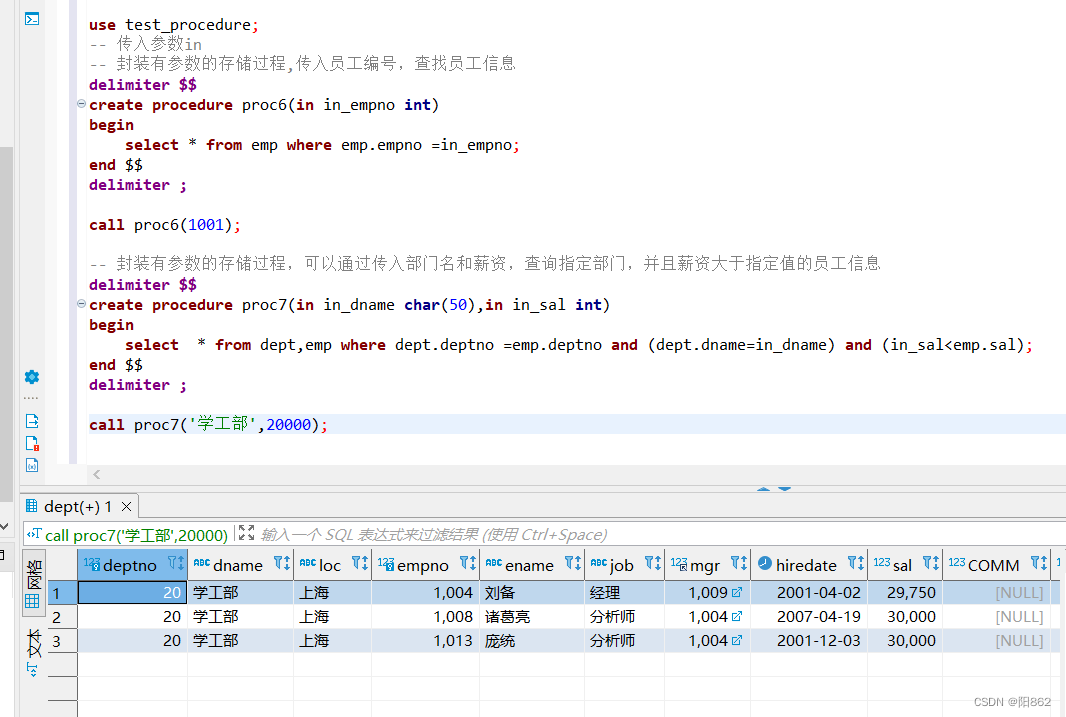 use test_procedure;-- 傳入參數in-- 封裝有參數的存儲過程,傳入員工編號,查找員工信息delimiter $$create procedure proc6(in in_empno int)begin select * from emp where emp.empno =in_empno;end $$delimiter ; call proc6(1001); -- 封裝有參數的存儲過程,可以通過傳入部門名和薪資,查詢指定部門,并且薪資大于指定值的員工信息delimiter $$create procedure proc7(in in_dname char(50),in in_sal int)begin select * from dept,emp where dept.deptno =emp.deptno and (dept.dname=in_dname) and (in_sal<emp.sal);end $$delimiter ; call proc7("學工部",20000);