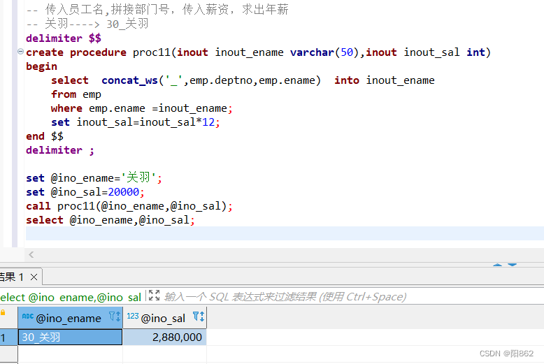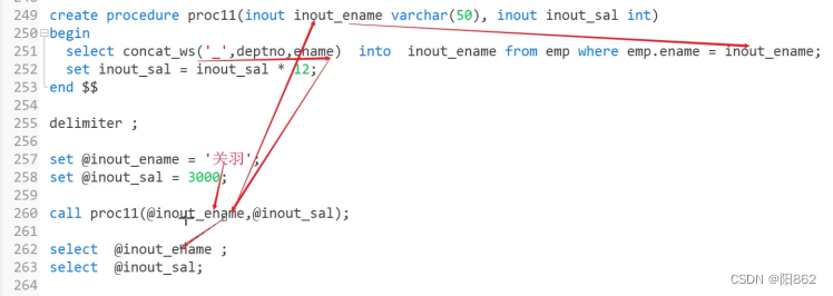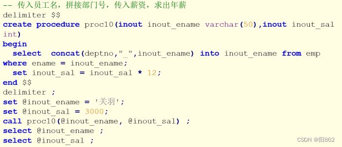 -- 傳入員工名,拼接部門號,傳入薪資,求出年薪-- 關羽----> 30_關羽delimiter $$create procedure proc11(inout inout_ename varchar(50),inout inout_sal int)begin select concat_ws("_",emp.deptno,emp.ename) into inout_ename from emp where emp.ename =inout_ename; set inout_sal=inout_sal*12;end $$delimiter ; set @ino_ename="關羽";set @ino_sal=20000;call proc11(@ino_ename,@ino_sal);select @ino_ename,@ino_sal;