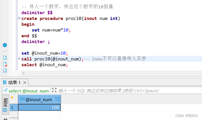-- 傳入一個數字,傳出這個數字的10倍值delimiter $$create procedure proc10(inout num int)begin set num=num*10;end $$delimiter ; set @inout_num=10;call proc10(@inout_num);-- inou不可以直接傳入實參select @inout_num;