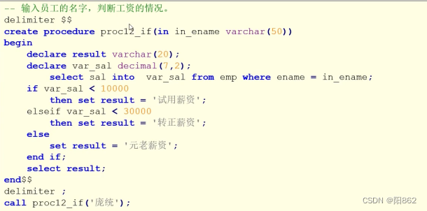 -- 輸入員工的名字,判斷工資的情況。/*sal < 10000:試用薪資sal >= 10000 and sal < 20000轉正薪資sal >= 20000 :元老薪資*/delimiter $$create procedure proc13(in in_ename varchar(50))begin declare de_sal decimal(7,2); declare de_result varchar(50); select emp.sal into de_sal from emp where emp.ename =in_ename; if de_sal<10000 then set de_result="試用薪資"; elseif de_sal<20000 then set de_result="轉正薪資"; else set de_result="元老薪資"; end if; select de_sal;end $$delimiter ; call proc13("關羽"); -- 這里用用戶變量處理,就不需要先定義delimiter $$create procedure proc14(in in_ename varchar(50))begin declare de_sal decimal(7,2); select emp.sal into @de_sal from emp where emp.ename =in_ename; if @de_sal<10000 then set @de_result="試用薪資"; elseif @de_sal<20000 then set @de_result="轉正薪資"; else set @de_result="元老薪資"; end if; end $$delimiter ; call proc14("關羽");select @de_sal; -- 這里是把select放在里面delimiter $$create procedure proc15(in in_ename varchar(50))begin declare de_sal decimal(7,2); select emp.sal into @de_sal from emp where emp.ename =in_ename; if @de_sal<10000 then set @de_result="試用薪資"; elseif @de_sal<20000 then set @de_result="轉正薪資"; else set @de_result="元老薪資"; end if; select @de_sal;end $$delimiter ; call proc15("關羽");五.流程控制—case