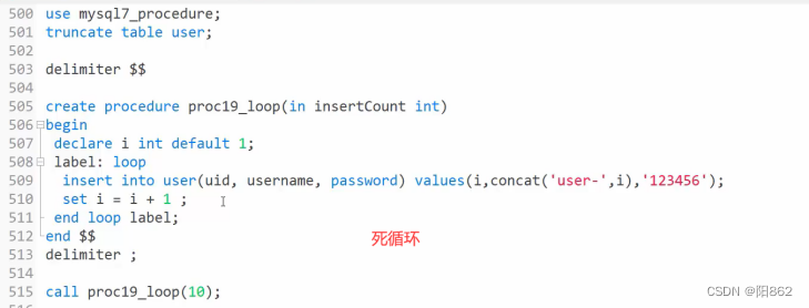 /*【標簽:】while循環條件do 循環體;end while【標簽】;-*/-- 需求:向表中添加指定條數的數據-- -------存儲過程-循環-while delimiter $$create procedure proc18(in in_count int)begin declare i int default 1; label:while i<=in_count do insert into user(id,name,password) values(i,concat("user-",i),123456); set i=i+1; if i=5 then leave label; end if; end while label; end $$delimiter ;call proc18(10);這里我的理解,當要使用leave、iterate時要寫label就相當于一個名字,當然這個label可以用其他字符代替比如a,只要在使用leave、iterate時后面加上自己定義的label就行