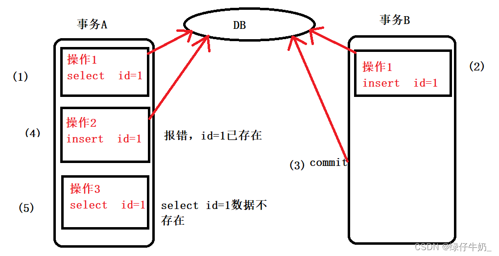 事務AB并發下操作數據庫中同一數據,事務A首先查詢了數據庫中是否有id=1的數據,沒有就插入。那么此時事務A未查詢到該數據存在,同時事務B執行了插入操作插入了id=1的數據并且提交。那么事務A再去插入的時候則會報主鍵沖突的錯誤,但是當事務A再一次去查的時候發現id=1的數據仍然是不存在( 前提是已經解決了不可重復讀的問題,一個事務多次訪問同一數據的結果是一致的 ),這種情況就稱之為幻讀