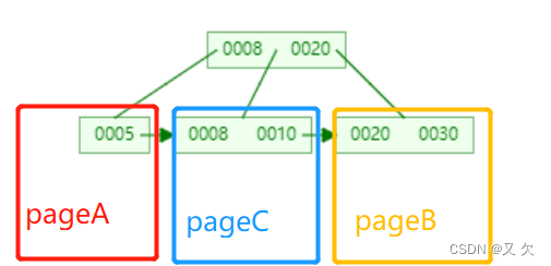 可以看到,由于page A滿了,再插入一個ID是8的數(shù)據(jù)時,就不得不再申請一個新的頁面 page C來保存數(shù)據(jù)了。