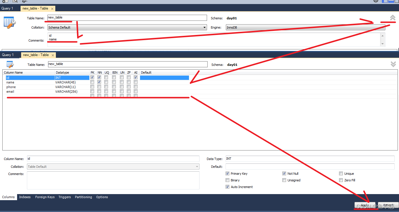 填寫Table Name,Comments之后點擊向上的箭頭,填寫Column信息。