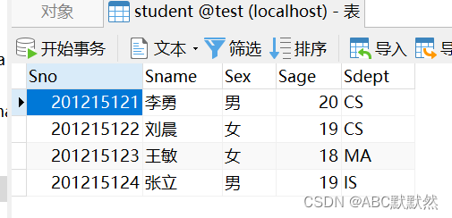 create table Student( Sno int not null auto_increment primary key,Sname varchar(10) not null,Sex char(1) not null,Sage tinyint(100) not null,Sdept char(4) not null)comment = "學生表";//建表語句alter table Student auto_increment = 201215121;insert into Student (Sname, Sex, Sage, Sdept) values ("李勇", "男", 20, "CS");insert into Student (Sname, Sex, Sage, Sdept) values ("劉晨", "女", 19, "CS");insert into Student (Sname, Sex, Sage, Sdept) values ("王敏", "女", 18, "MA");insert into Student (Sname, Sex, Sage, Sdept) values ("張立", "男", 19, "IS");//加載數據進表