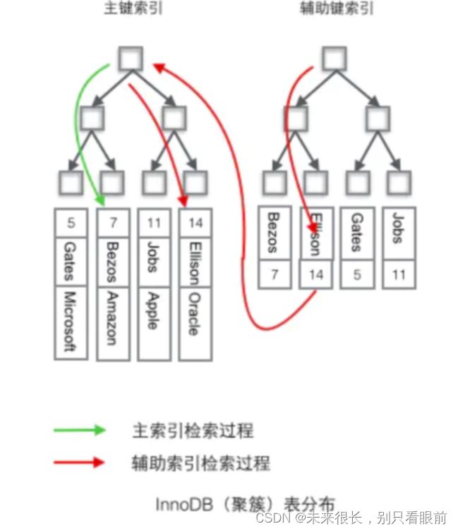 - 若對Name列進行條件搜索,則需要兩個步驟:第一步在輔助索引B+樹中檢索Name,到達其葉子節點獲取對應的主鍵。第二步使用主鍵在主索引B+樹種再執行一次B+樹檢索操作,最終到達葉子節點即可獲取整行數據。(重點在于通過其他鍵需要建立輔助索引)