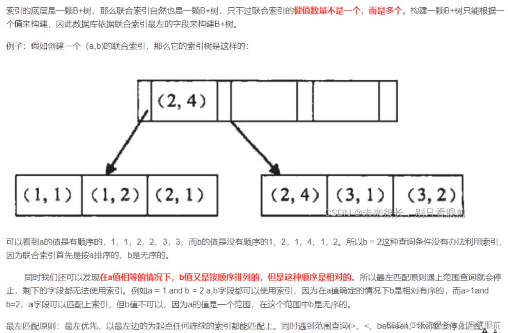 比如:有1000W條數據的表,有如下sql:select from table where a =1 and b =2 and c =3,假設假設每個條件可以篩選出10%的數據,如果只有單值索引,那么通過該索引能篩選出1000W10%=100w條數據,然后再回表從100w條數據中找到符合b =2 and c = 3的數據,然后再排序,再分頁;如果是聯合索引,通過索引篩選出1000w10% 10% *10%=1w,效率提升可想而知!